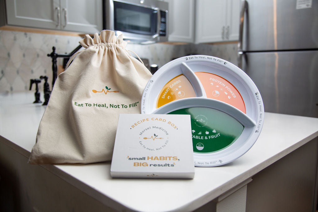 The Morsel Medicine™ Smart Portion Plate + Recipe Card Deck is a practical, research-informed nutrition tool designed to help individuals and families build balanced meals with confidence.